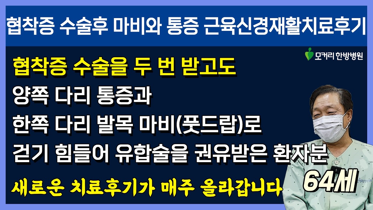 협착증 수술 두 번 후에 발생한 발목마비(족하수)와 양쪽 다리 방사통 근육신경재활치료후기