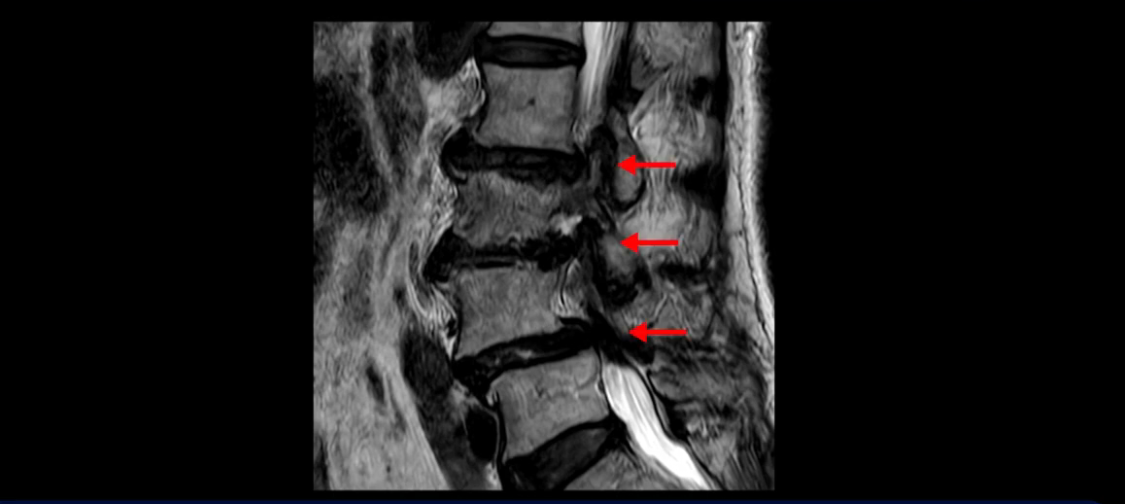 이분 MRI 보시면 허리 3마디의 퇴행이 매우 심합니다.
